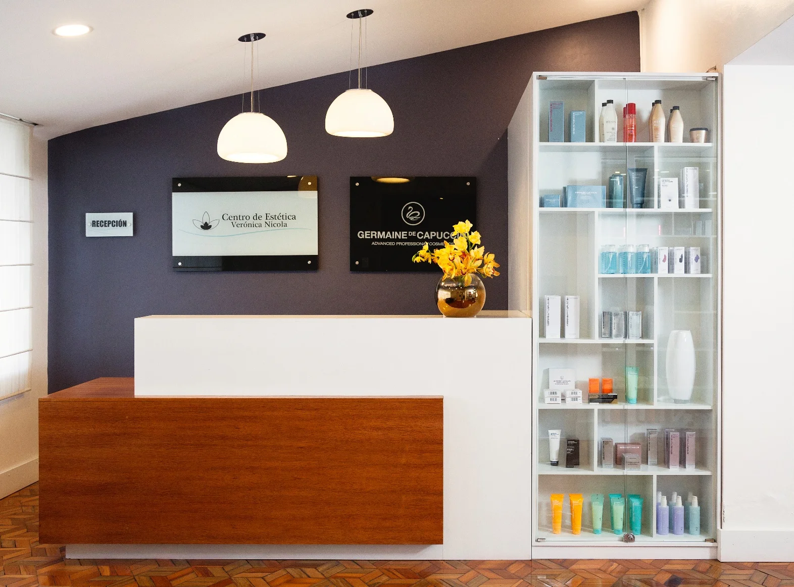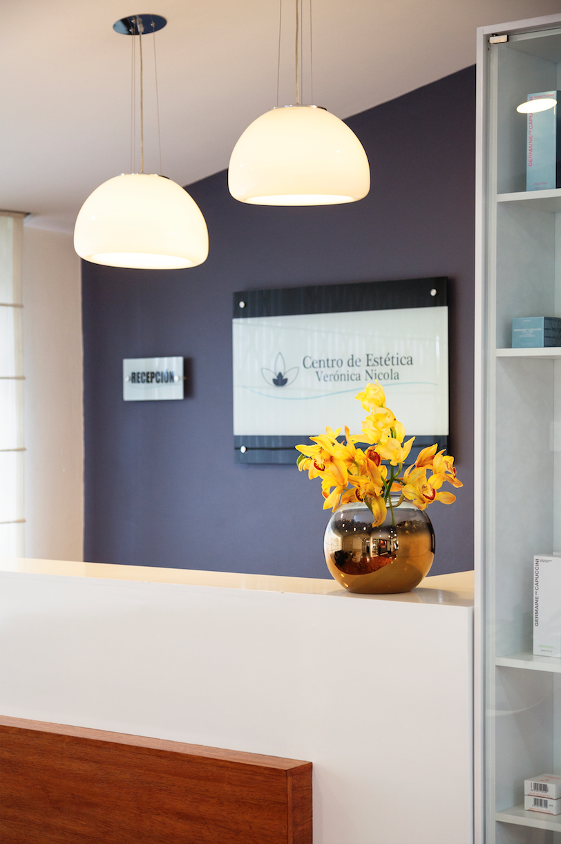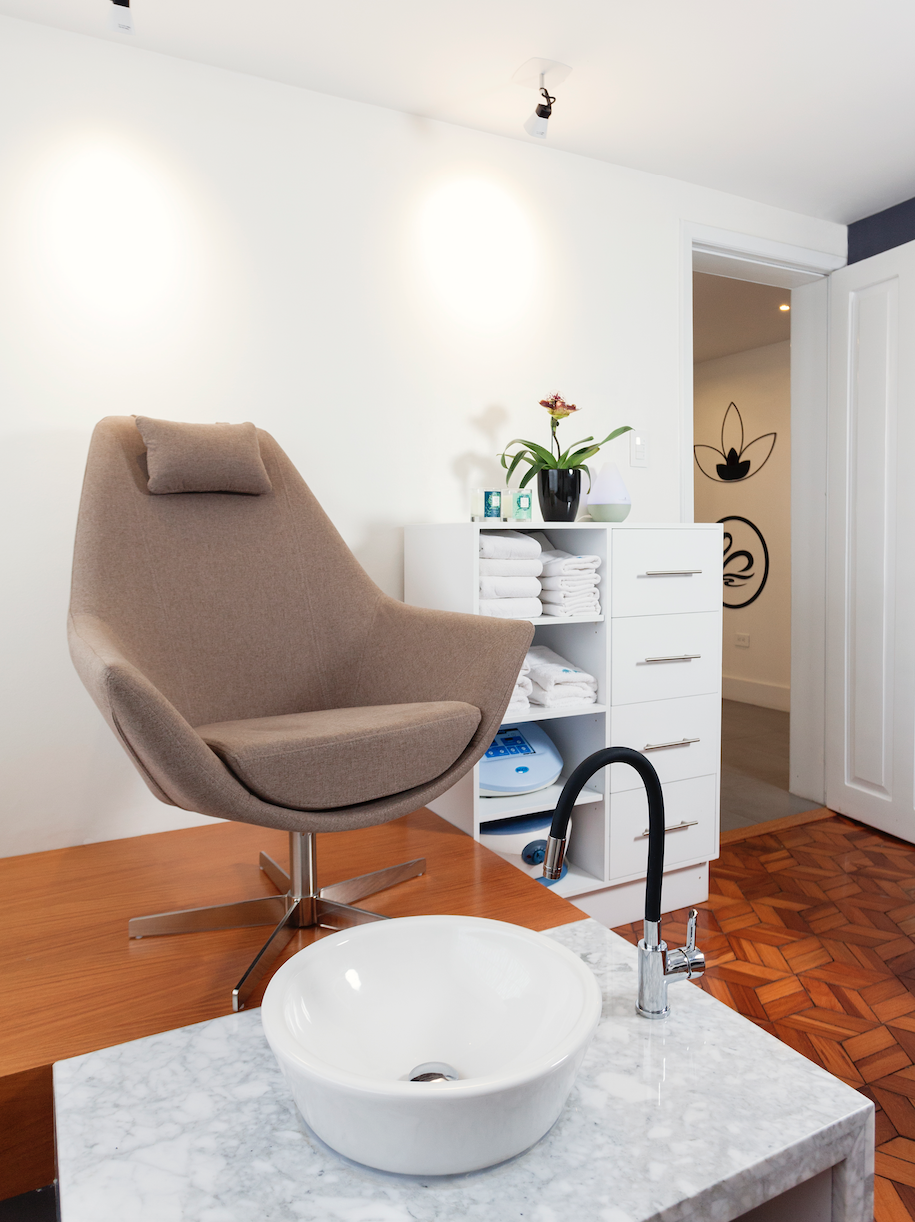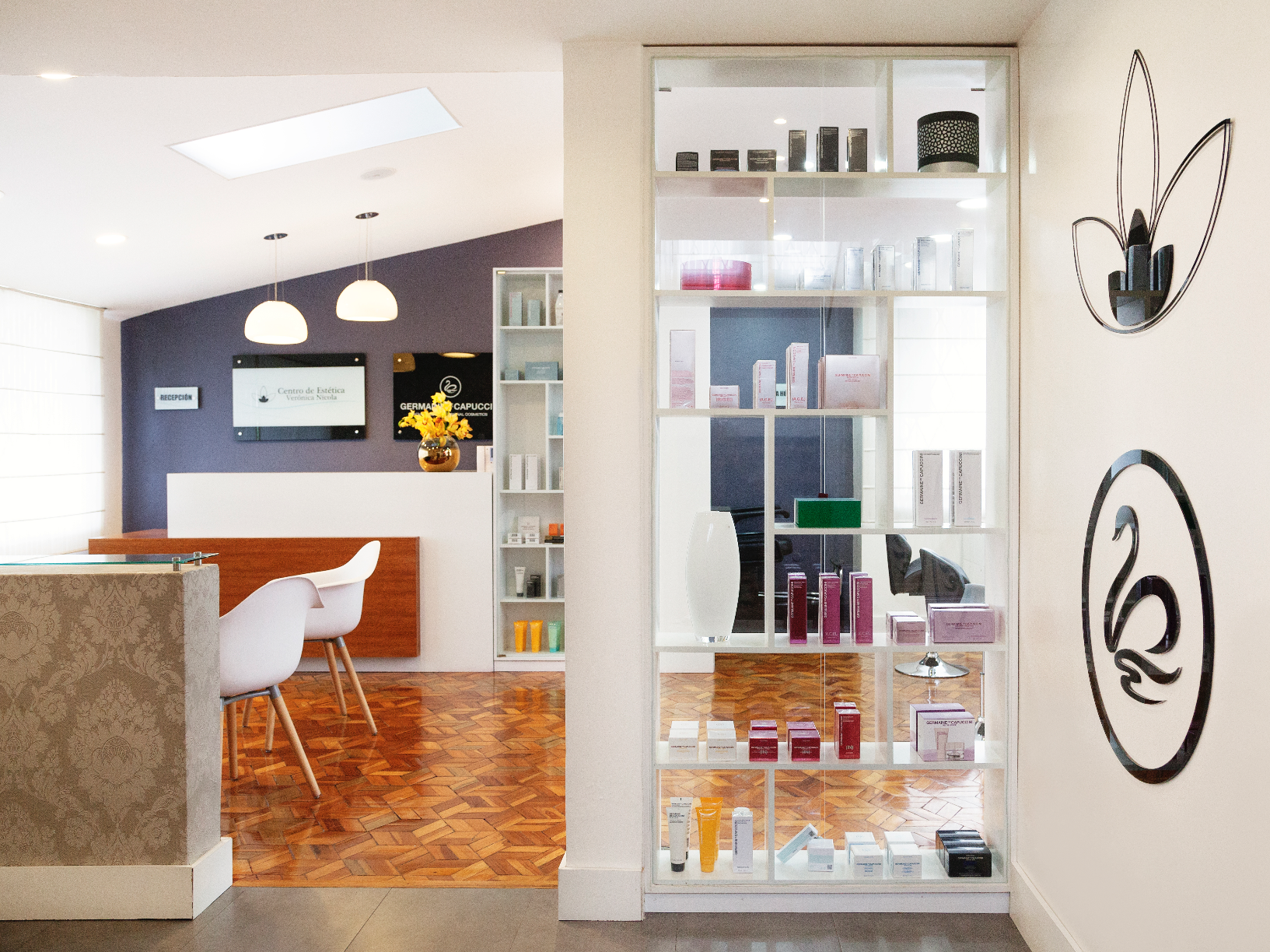 Todos en algún momento de nuestras vidas nos merecemos hacer una pausa, gozar de un tiempo de relajación y sumergirnos en un mundo de tratamientos y terapias que nos procuren bienestar, salud y belleza. Partiendo de esta verdad, hemos creado un espacio acogedor y discreto que evoca paz y tranquilidad. El uso de diversas texturas y materiales, en mobiliario y paredes, a tono con el piso antiguo dan una sensación de calidez y armonía. Se observa un delicado balance donde el uso del blanco en paredes aporta luminosidad y frescura, en contraste con paredes grises en zonas puntuales que generan profundidad y dan un carácter particular al espacio. La materialidad del mobiliario juega con esta cromática. Su cuidado diseño permite abrir y crecer el espacio, mientras que el papel tapiz de rica textura en la pared del ingreso da un toque de sofisticación. El elemento atractivo visual son las lámparas sobre el counter.